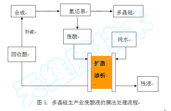 多晶硅是制造單晶硅、太陽能電池及高純硅制品的主要原料。在多晶硅的生產中會產生大量的廢酸。用擴散滲析法回收該廢酸再返回系統使用,這樣既為企業節約了資源,又解決了環境污染問題。
