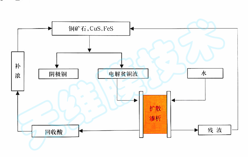 濕法煉銅生產中產生大量的電解貧液,若用石灰中和,除造成酸和銅的損失外,還引發環境問題。用陰膜擴散滲析回收電解貧液中的廢酸再返回系統使用,這樣既為企業節約了資源,又解決了環境污染問題。