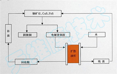 濕法煉銅生產中產生大量的電解貧液,若用石灰中和,除造成酸和銅的損失外,還引發環境問題。用陰膜擴散滲析回收電解貧液中的廢酸再返回系統使用,這樣既為企業節約了資源,又解決了環境污染問題。